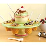 This hand-painted earthenware and wooden lazy Susan set lets you conveniently serve your favorite ice cream toppings. Center bowl holds 8 ounces of hot fudge, caramel or butterscotch and has a ladle for serving. The set also includes six dishes with spo Read more
